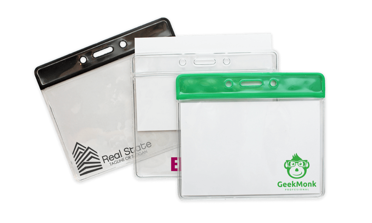 Personnalisez le porte-badge à votre image ! Pochette en vinyle transparent avec barre de couleur supérieure et perforations oblongue et circulaires.Idéal pour les cartes ou badges d'identication au format carte de crédit !