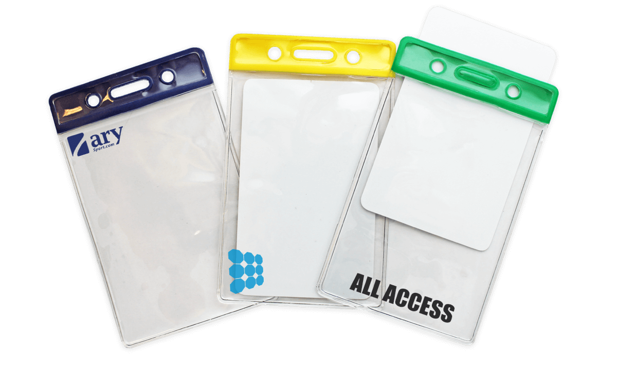 Personnalisez le porte-badge à votre image ! Pochette en vinyle transparent avec barre de couleur supérieure, une perforation oblongue et deux circulaires pour les chaînettes.Idéal pour les cartes ou badges d'identication au format carte de crédit !